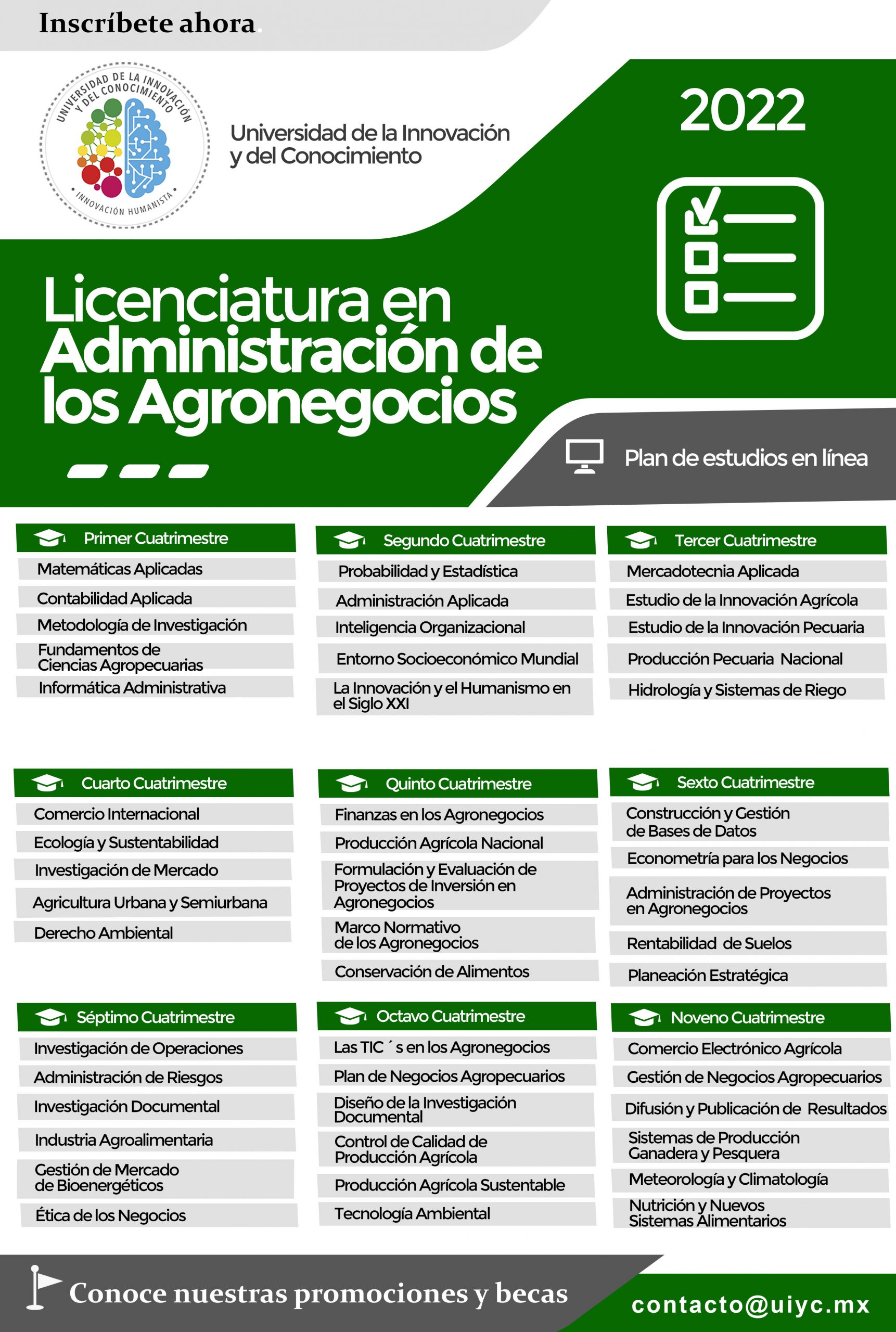 Formar profesionistas capaces de aportar innovaciones en los procesos de producción, almacenamiento, empaque, distribución y comercialización de productos relacionados con las actividades agropecuarias, mediante el empleo óptimo de conocimientos, habilidades y actitudes en materia de los agronegocios, y así contribuir a garantizar la seguridad alimentaria y la sustentabilidad del medio ambiente para cubrir las demandas del mercado local, regional, nacional e internacional.